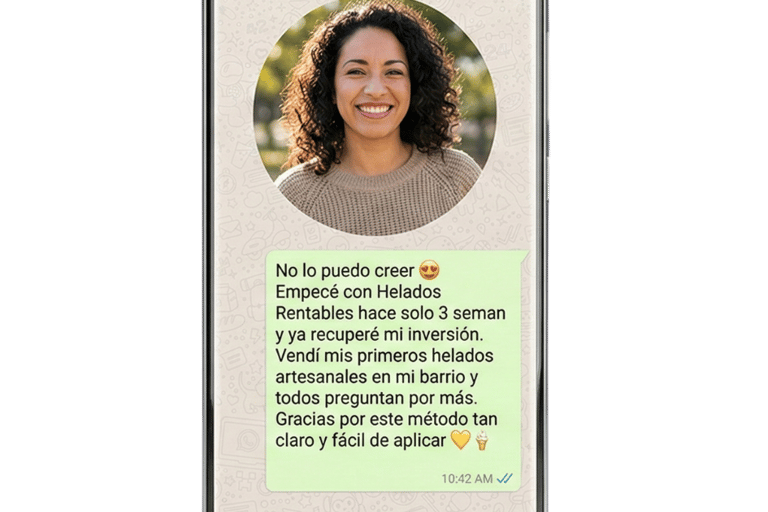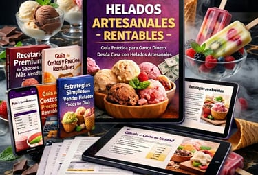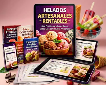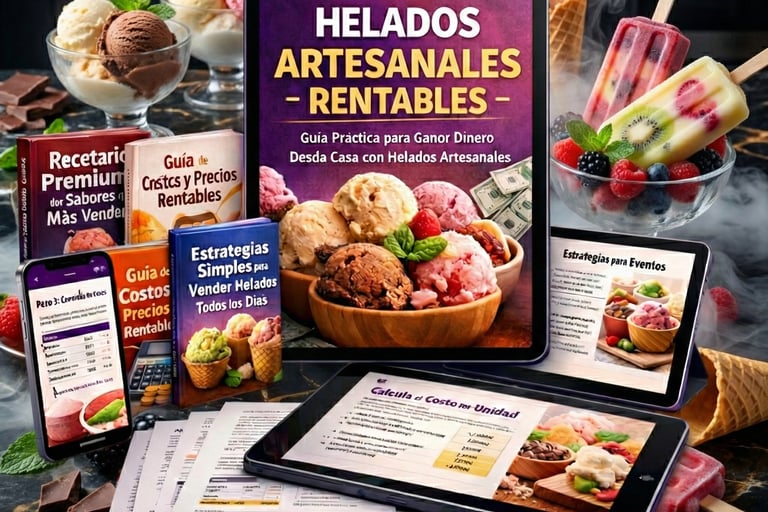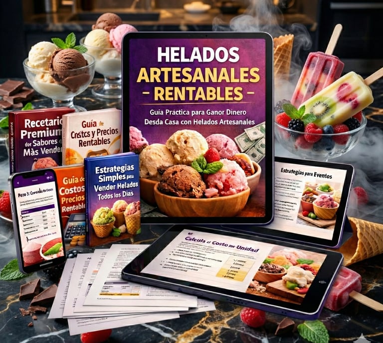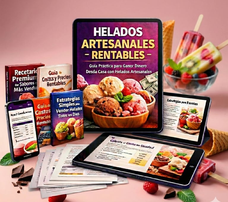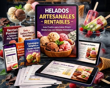 Recibirás un sistema completo y práctico de negocio, compuesto por guías claras, recetas rentables y estrategias paso a paso que te enseñan cómo producir, calcular y vender helados artesanales con método y ganancia real.